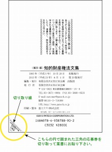 「(電子版)知的財産権法文集」の無料配布についてご案内申し上げます。 「(第20版)知的財産権法文集」をご購入戴いた方限定となりますが、同書の知的財産権関係法律をPDF化したものを無料で進呈いたします。スマートフォンを始め、ipad、PC等で閲覧することができ、手軽にいつでもどこでへも持ち歩いて条文を確認することができ大変便利です。期間限定ですので、お早めにお申し込み戴きますようお願い申し上げます。 お申し込み方法は下記の通りです。 記 1.同書の奥付の下部の三角の応募券を切り取ってください。 (左記の図面の黄色円で囲まれたところです。コピー不可です。) 2.切り取った応募券を葉書にしっかりと貼り付けて下記住所までお送り下さい。 〒124-0021 東京都葛飾区細田5−15−8 有限会社PATECH企画 「(電子版)知的財産権法文集」配布係 宛 3.葉書には、下記の項目をお書き添え下さい。 ・お申し込み者本人のご氏名、ふりがな ・ご住所 ・連絡先お電話番号 ・E-mailアドレス(メールにて添付ファイルとして送付しますので、正確にはっきりとお書き下さい。不明の場合は送付できない場合もあります。) 配布期間 平成26年3月31日まで延長になりました。 下記の書籍をご購入された方が対象となりますので、ご注意下さい。 (第20版)(平成26年度弁理士試験対応版) |